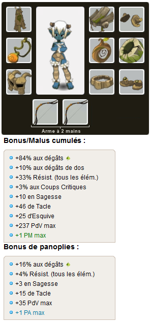 ![]() Sans me coûter le moindre Pa! ![]() Je commencerai par vous présenter les Caractéristiques à monter. Par la suite, je détaillerai l'Équipement à utiliser. On continuera avec les Sorts utilisés. Ensuite, nous passerons à ceux du Gobgob. J'enchainerai sur une partie Stratégie. Laquelle partie sera complétée par les Combos. Et pour finir, une rapide Conclusion!![]() ![]() Voyons ensemble les caractéristiques existantes, pour que vous compreniez mes choix (et pour que je rallonge cette partie) : La Vitalité : important, certes, mais vous n'êtes pas axé Tank au point de mettre des points ici. De plus, le Gobgob a de très bonnes capacités de soins. Initiative : très important, surtout en PvP, mais n'est rentable qu'à très gros investissement. Tacle/Esquive : nos capacités de placement nous suffiront. De plus, si vous connaissez Ankama et surtout les probas, vous savez que vous pouvez vous faire tacler 10 fois d'affilé à 85% de chance de partir. Art du Barda : on en utilisera que quelques uns pour le stuff final, sinon soyez patient. Coups Critiques : son coup est trop élevé pour y investir vraiment. Et encore une fois, on retombe sur les probabilités. Point d'Action : indispensable pour atteindre un mode 10 Pa (voire 12 Pa en Dragon, mais encore une fois ce n'est pas le sujet de ce build). Vendu! Point de Mouvement : vous donne une mobilité non-négligeable et vous permet de mieux encaisser les coups en Pm de certains sorts Terre. On prend! Force/Agilité/Intelligence/Chance : un rendement à partir du dixième/vingtième niveau, ce qui nous arrange bien puisque le coup est faible. Pour nous, c'est la Force! Volonté : depuis quand est-ce qu'un osamodas Terre applique des états ayant un pourcentage de chance? Inutile pour nous. Perception : ce build n'est pas axé PvP, nous n'avons donc pas besoin Portée : ah, j'hésitais... Mais j'ai craqué et je ne le regrette pas. Vu notre Portée moyenne, on ne peut s'en passer. Parade : même principe que les CC, trop couteux pour être rentable sans gros investissement.Voici la répartition : Niveau 1-31 : économisez pour 1Pa Niveau 31-51 : prenez 1 Pm Niveau 51-61 : investissez dans 1Po Niveau 67-145 : mettez tout en Force! ![]() Stats au niveau 140 ![]() ![]() Progression des stuffs Voici la progression des stuffs. Je ne montre pas les premiers, estimant que vous pouvez vous débrouiller. Au besoin, demandez-moi que mettre (en commentaire pour gonfler mon score, évidemment!) Niveau 55 (mode 8pa/5Pm) ![]() Détails : Panoplie Abra (lv 55) Anneau Craquelé (lv 47) Arc Riktus Elite (lv 55) 6 emplacements de runesNiveau 66 (8Pa/5Pm) ![]() Détails : Panoplie Zespadon Ivoire (lv 62) Coiffe Mulante (lv 65) Ceinture Mulante (lv 63) Amulette en Crocs (lv 66) Bague Imperator (lv 63) Anshin (lv 60) Pourfendeuse de Trool (lv 65) 6 emplacements de runesNiveau 84 (8-10Pa/6Pm) ![]() Détails : Panoplie Katrepat (lv 84) Cape Riktus Elite (lv 54) Epaulettes Mulantes (lv 67) Ilalano (lv 75) Anneau de Sable (lv 90) Marteau Xik (lv 87) 6 emplacements de runesÉquipements 100 et plus Ce stuff est fait pour vous fournir le plus de dégâts terre et de soins possibles. Il est certes très cher mais vous permet d'optimiser votre puissance et celle du Gobgob. Niveau 105 (10 Pa/6 Pm) ![]() Détails : Panoplie Phosphorescente (lv 97) Panoplie Flakimpérial (lv 76) Crape d'Or (lv 105) Spallières du Soigneur Impérial (lv 100) Lame de Zéorus (lv 100) La Sanguinaire (lv 105) 8 emplacements de runes![]() Panoplie Phosphorescente :Le mélange de cette panoplie et de la suivante est très connu pour être adapté à un DD. En l’occurrence, notre objectif à nous n'est pas de frapper très fort, mais de soigner autant que possible. Et puisque nos dégâts terre (et dégâts all) sont transmis en dégâts eau au Gobgob, avoir beaucoup de dégâts, c'est bon pour le soin! De plus, comme son essaie de se "cacher" derrière le Gobgob, avoir beaucoup de vie n'est pas une priorité en soi. Cette panoplie est donc à prendre absolument! Elle nous octroie plus de 80% aux dégâts Terre, 2 Pm, 4 niveaux sorts terre, 11% CC, de la Vitalité, de l'Ini : tout gagnant! ![]() Panoplie Flakimpérial :Ce duo est avec la précédente est, au risque de me répéter, célèbre. Il a longtemps été un très bon stuff final faute de Magmog. Certes, certes elle n'est que niveau 76. Mais elle complète la précédente au niveau des emplacements, et nous offre de la Vie, presque 60% Terre, 1 très beau Po et surtout +7 lvl sort Terre! ![]() Crape d'Or :Avec les deux autres panoplies, il nous manque 1 Pa pour atteindre le 10 Pa. Le voilà sur cette cape. Que dire de plus? Elle nous donne le Pa qui nous intéresse, 26% Terre, 15d'Esquive et un petit brin de Vie. ![]() Spallières du Soigneur Impérial :Eh oui! Etant donné que les bonus aux soins, tout comme les dégâts, augmentent les soins du Gobgob, ceci est une perle! Des soins, des dégâts, de la vie... What else? Lame de Zeorus : Une arme légendaire à une main, avec des bonus adaptés à son statut de légende Assez peu de Vie mais c'est toujours ça (à une main!), de très jolis bonus aux dégâts, un brin d'Ini, des Coups Critiques et surtout le fameux Pa! Son coup en Pa nous permet éventuellement de nous en servir comme arme de frappe. La Sanguinaire : Voici la dague idéale pour la main gauche. Elle donne énormément de Vitalité pour une seule main, plus d'Ini que nos armes de première main, un brin de CC qui n'est pas pour nus déplaire et surtout, surtout, beaucoup de dégâts à une seule main. Son gros avantage, au delà du vol de vie, est qu'elle creuse l'écart entre vous et votre adversaire : imaginons que vous tapiez 150 avec, l'ennemi en perd 150 et vous en gagner 150, soit un écart de 300!Familier Le familier est un élément très important de votre stuff. Si vous voulez en savoir plus sur lui, un article lui est consacré. Vous avez bien sur votre Gélutin du début (pour en savoir plu