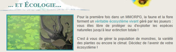 véritable écosystème vivant géré par les joueurs, protéger ou exploiter les espèces naturelles jusqu'à leur extinction totale, gérer la population de monstres, la variété des plantes ou encore le climat. Dans Wakfu, l'écologie c'est ça et uniquement ça.